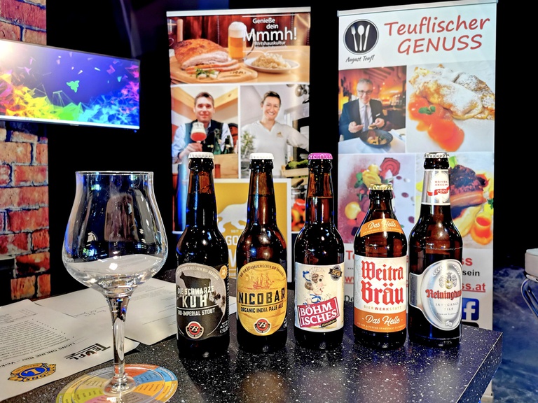 Gemeinsam mit 'Tourismusguru' August Teufl und Biersommelier Andreas Frey werden 5 unterschiedliche Biere verkostet! Durch Sehen, Riechen und Schmecken lernen Sie die Besonderheiten jedes Bieres mit allen Sinnen kennen. Hintergründe und witzige Anekdoten vervollständigen die bierigen Eindrücke. Und für Ihre Fragen ist natürlich auch ausreichend Zeit vorgesehen. Es werden herausragende Vertreter verschiedenster Bierstile verkostet. Die Reise geht von klassischen Bierstilen wie Pils über Märzen, Kreativbier, IPA, bis hin zum Imperial Stout.